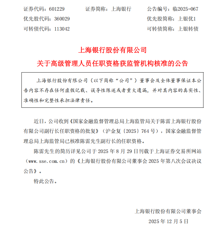 12月5日明福今投,上海银行股份有限公司发布关于高级管理人员任职资格获监管机构核准的公告,国家金融监督管理总局上海监管局已核准陈雷先生副行长的任职资格。