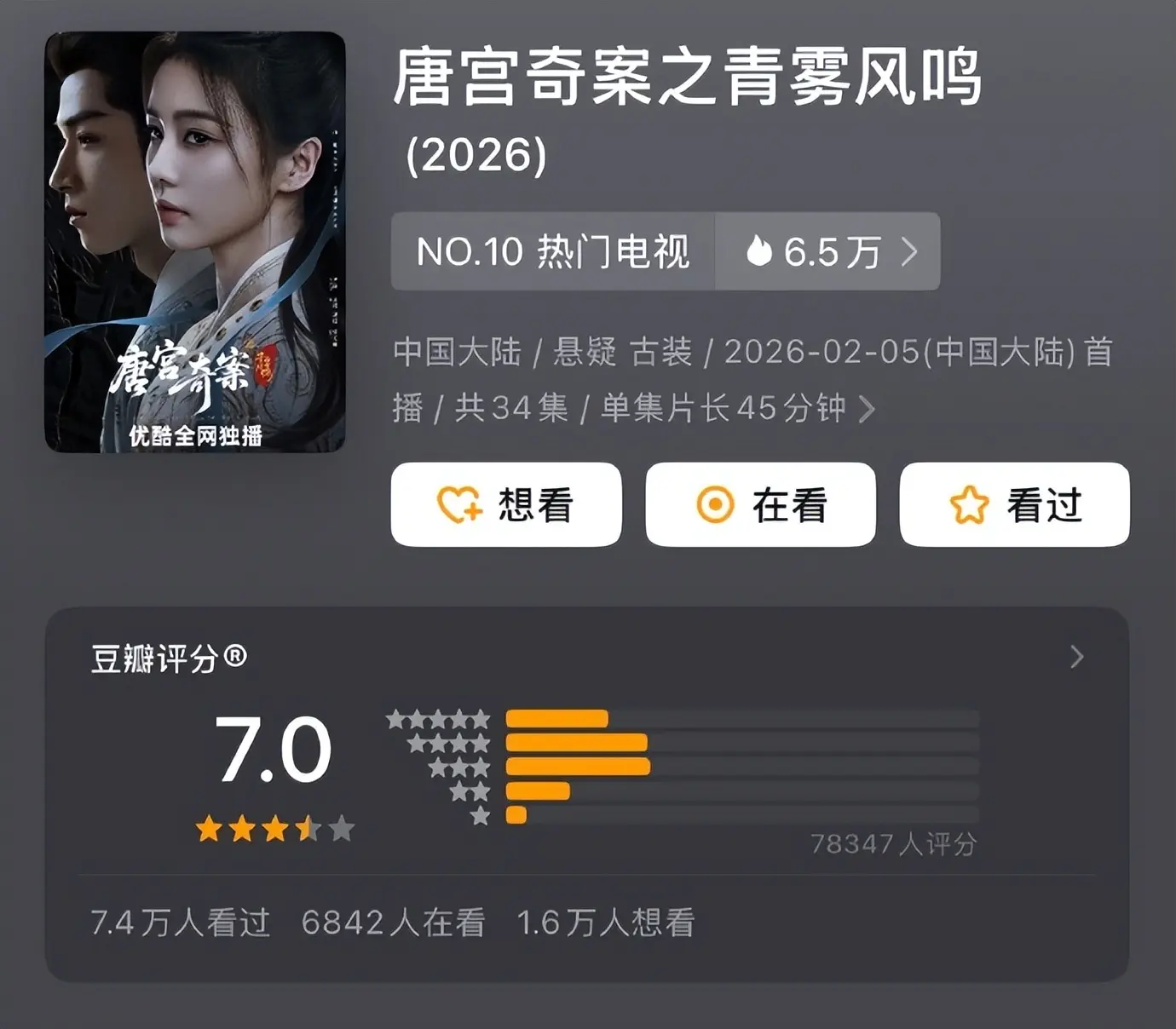 作为2月份热度最高的剧集,《唐宫奇案》拿下了7.0分的开分成绩。这个分数对于古装剧来说,算得上是中规中矩,既不算惊艳,也不至于让人失望。