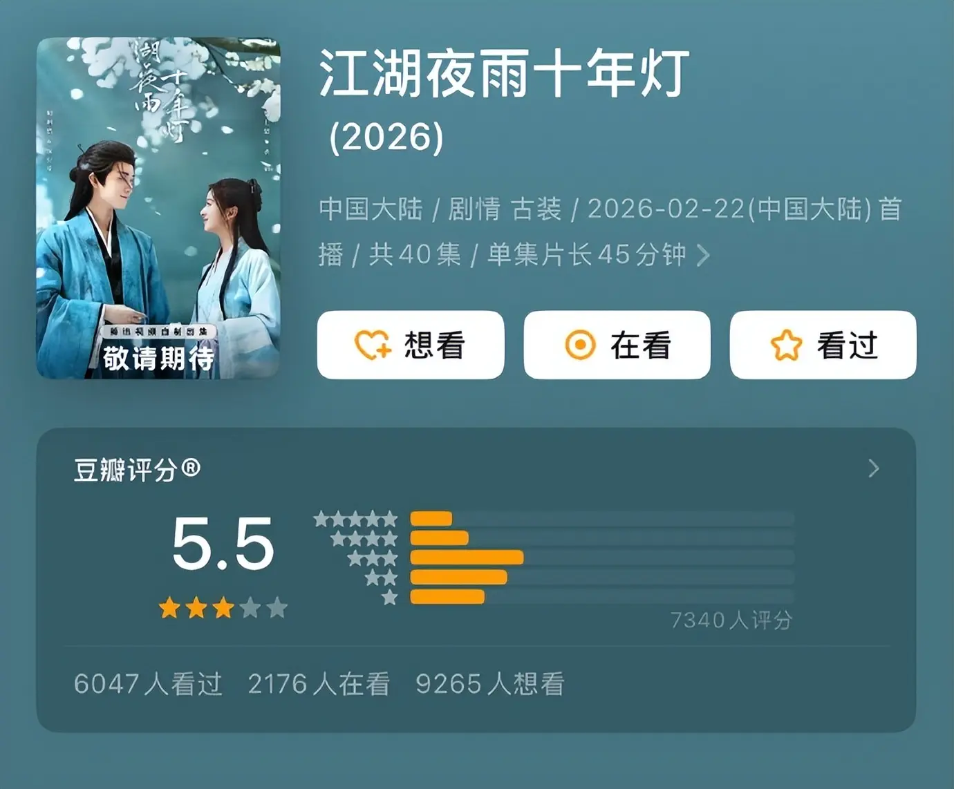 4部剧中,《江湖夜雨十年灯》可以说是最惨的一位。开分5.5,同期垫底;打分人数最少,热度最低。